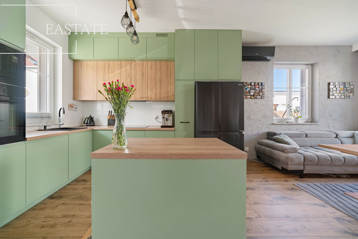 - Zabudowa kuchenna wykonana na wymiar, atutem jest wyspa na kółkach, co pozwala na zdobycie większej powierzchni przy organizacji spotkań.