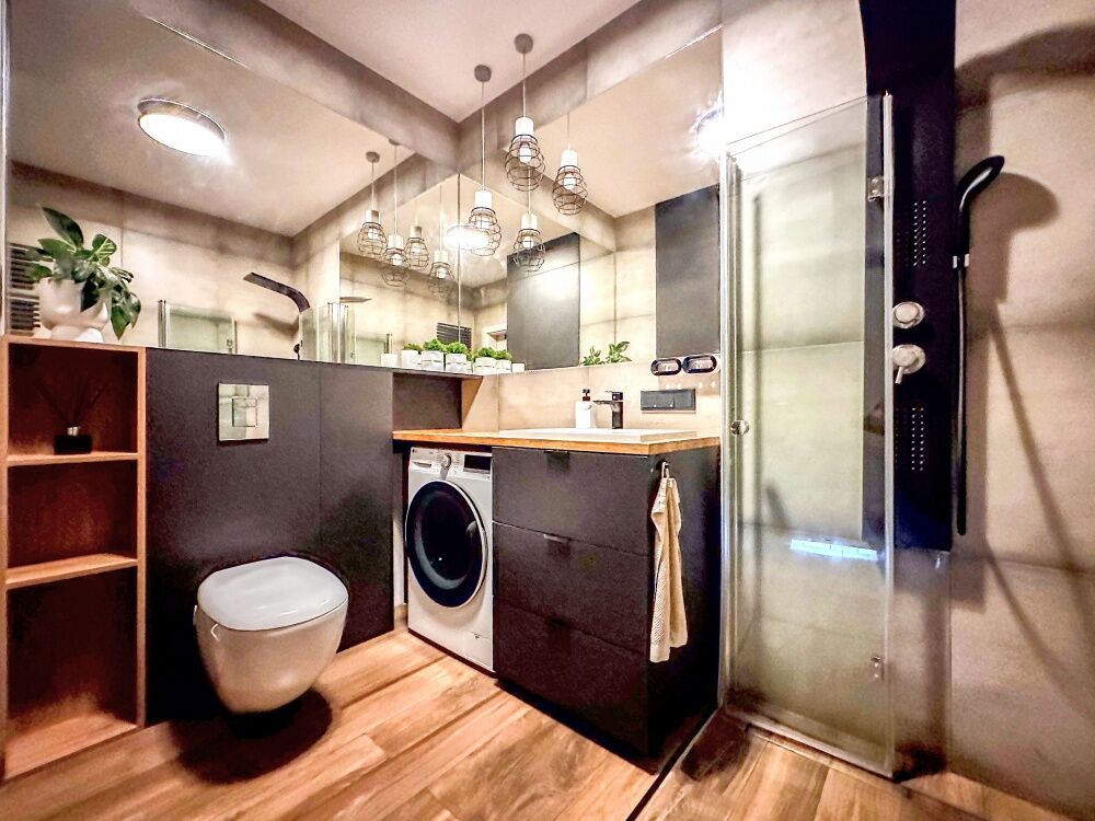 • nowoczesną kuchnię z zabudową do sufitu, blatem z konglomeratu oraz pełnym AGD,