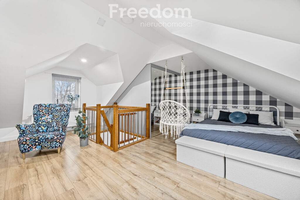 Na piętrze mieszczą się dwie komfortowe sypialnie, zaprojektowane